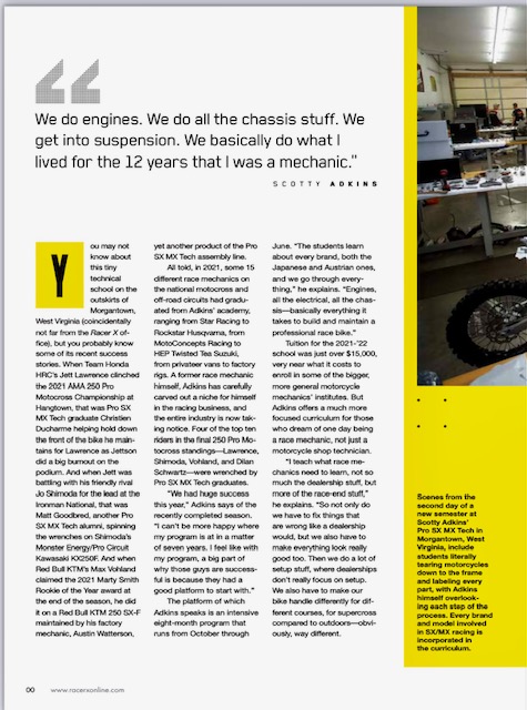 Racerxonline January 2022 issue completed an amazing article on Pro SXMX Tech and instructor Scott Adkins! Amazing results coming out of Pro SX MX Tech! The industry is full of mechanics that trained here and are now living their dream! All it takes is hard work and dedication and Pro SXMX Tech can make your dream a reality!! The proof is in the results! See full article here: